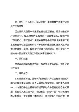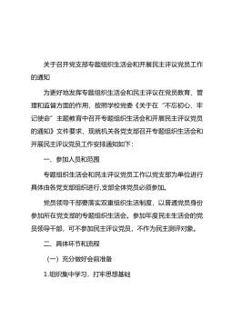 关于召开党支部专题组织生活会和开展民主评议党员工作的通知为更好地发挥专题组织生活会和民主评议在党员教育、管理和监督方面的作用,按照学校党委《关于在“不忘初心、牢记使命”主题教育中召开专题组织生活会和开展民主评议党员的通知》文件要求,现就机关各党支部召开专题组织生活会和开展民主评议党员工作安排通知如下:一、参加人员和范围专题组织生活会和民主评议党员工作以党支部为单位进行具体由各党支部组织进行,支部全体党员必须参加。党员领导干部要落实双重组织生活制度,以普通党员身份参加所在党支部的专题组织生活会。参加年度民主生活会的党员领导干部,可不参加民主评议党员,不作为民主测评对象。二、具体环节和流程(一)充...