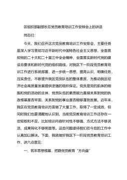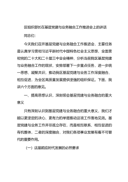 区组织部长在村(社区)“两委”班子履职能力提升培训会上的讲话同志们:今天,我们召开这次村(社区)“两委”班子履职能力提升培训会,主要目的是深入学习贯彻习近平新时代中国特色社会主义思想,特别是习近平总书记关于基层治理的重要论述,进一步提升全区村(社区)“两委”班子的履职能力和水平,为推动我区基层治理体系和治理能力现代化奠定坚实基础。参会人员涵盖了区组织部班子成员、各区直部门分管负责人、乡镇(街道)书记以及村(社区)“两委”班子成员,这充分体现了我们对基层工作的高度重视。下面,我讲六个方面的意见。一、筑牢政治根基,把稳履职方向盘政治属性是基层组织的根本属性,政治建设是基层工作的首要任务。村(社区)...