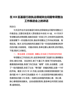 在XX区基层行政执法领域突出问题专项整治工作推进会上的讲话同志们:今天召开这次全区基层行政执法领域突出问题专项整治工作推进会,主要任务是深入贯彻落实中央和XX省、XX市关于专项整治的决策部署,回顾总结前一阶段工作,分析研判当前形势,安排部署下一阶段重点任务,推动专项整治工作向纵深发展、取得实效。刚才,区司法局的同志通报了前一阶段的进展情况和存在的问题,内容客观、问题点得准,各单位要认真对照,抓好落实。下面,我讲三点意见。一、肯定成绩,正视差距,清醒认识当前工作的阶段性特征专项整治工作启动以来,全区各相关部门迅速行动,围绕整治目标,细化方案、压实责任,做了大量工作,取得了阶段性成效。最直观的体现...