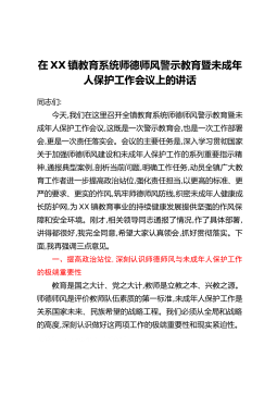 在XX镇教育系统师德师风警示教育暨未成年人保护工作会议上的讲话同志们:今天,我们在这里召开全镇教育系统师德师风警示教育暨未成年人保护工作会议,这既是一次警示教育会,也是一次工作部署会,更是一次责任落实会。会议的主要任务是,深入学习贯彻国家关于加强师德师风建设和未成年人保护工作的系列重要指示精神,通报典型案例,剖析当前问题,明确工作任务,动员全镇广大教育工作者进一步提高政治站位,强化责任担当,以更高的标准、更严的要求、更实的作风,筑牢师德师风防线,织密未成年人健康成长防护网,为XX镇教育事业的持续健康发展提供坚强的作风保障和安全环境。刚才,相关领导同志通报了情况,作了具体部署,讲得都很好,我完全...