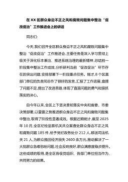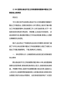 在XX区群众身边不正之风和腐败问题集中整治工作推进会上的讲话同志们:今天,我们召开全区群众身边不正之风和腐败问题集中整治工作推进会,主要任务是深入学习贯彻上级关于集中整治工作的最新精神,总结前期工作,分析当前形势,对下一阶段的攻坚任务进行再动员、再部署,以决战决令的姿态、决战决胜的行动,推动集中整治工作向纵深发展,取得让人民群众满意的扎实成效。刚才,会议传达了市委相关会议和文件精神,相关部门通报了今年以来全区集中整治工作的进展情况,肯定了成绩,也指出了问题,我都赞同。下面,我再讲三点意见。一、深化思想认识,以高度的政治自觉扛起为民除害的如山使命群众身边的不正之风和腐败问题,看似小事,实则直接啃...