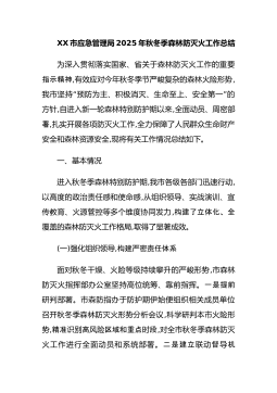 XX市应急管理局2025年秋冬季森林防灭火工作总结为深入贯彻落实国家、省关于森林防灭火工作的重要指示精神,有效应对今年秋冬季节严峻复杂的森林火险形势,“”我市坚持预防为主、积极消灭、生命至上、安全第一的方针,自进入新一轮森林特别防护期以来,全面动员、周密部署,扎实开展各项防灭火工作,全力保障了人民群众生命财产安全和森林资源安全,现将有关工作情况总结如下。一、基本情况进入秋冬季森林特别防护期,我市各级各部门迅速行动,以高度的政治责任感和使命感,从组织领导、实战演训、宣传教育、火源管控等多个维度协同发力,构建了立体化、全覆盖的森林防灭火工作格局,取得了显著成效。(一)强化组织领导,构建密任体系严责...