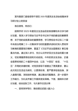 区直部门党组书记在2025年度党员领导干部民主生活会会前集中研讨会上的总结讲话同志们:为深入学习贯彻习近平新时代中国特色社会主义思想,扎实打好2025年度民主生活会的思想基础,今天,组织召开民主生活会会前集中学习研讨。刚才,我们集中组织学习了《习近平总书记关于党的建设的重要思想概论》《习近平关于加强党的作风建设的论述摘编》等重要内容,班子成员结合工作实际和各自分管工作,交流学习体会。大家的发言紧扣主题、思考深入、联系实际,体现了理论学习的成果和思想认识的提升,为开好民主生活会打下了坚实的思想基础。高质量召开民主生活会是严肃党内政治生活、推进全面从严治党的重要举措,是刀刃向内、自我革命,发现问题...