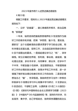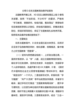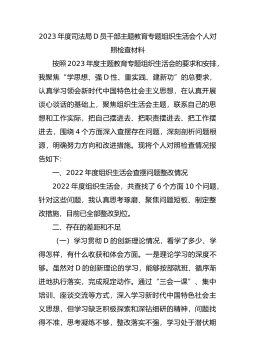 2023年度司法局D员干部主题教育专题组织生活会个人对照检查材料按照2023年度主题教育专题组织生活会的要求和安排,我聚焦“学思想、强D性、重实践、建新功”的总要求,认真学习领会新时代中国特色社会主义思想,在认真开展谈心谈话的基础上,聚焦组织生活会主题,联系自己的思想和工作实际,把自己摆进去、把职责摆进去、把工作摆进去,围绕4个方面深入查摆存在问题,深刻剖析问题根源,明确努力方向和改进措施。现将个人对照检查情况报告如下:一、2022年度组织生活会查摆问题整改情况2022年度组织生活会,共查找了6个方面10个问题,针对这些问题,我认真思考琢磨、聚焦问题短板、制定整改措施,目前已全部整改到位。二、...