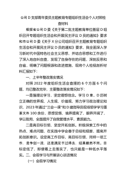 公司D支部青年委员主题教育专题组织生活会个人对照检查材料根据省公司D委《关于第二批主题教育单位基层D组织召开专题组织生活会和开展民主评议D员的通知》要求和市公司D委《关于X分公司组织召开主题教育专题组织生活会和开展民主评议D员的通知》要求,我全面深入学习新时代中国特色社会主义思想,并结合思想和工作进行了深入地自纠自查,发现了自身存在的问题,深刻反思和自省,明确了问题根源和改进措施,现将个人检视剖析材料汇报如下:一、上半年整改落实情况对照2022年度组织生活会查摆的6个方面6个问题,均已整改完毕,主要整改落实情况如下:一是强理论学习,坚定理想信念。学习D章、D历树立正确的世界观、人生观、价值观,...