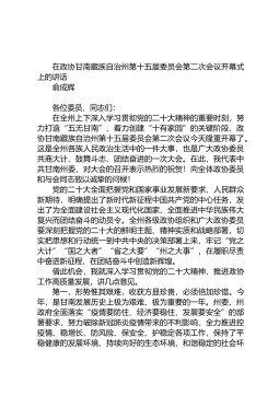 在政协甘南藏族自治州第十五届委员会第二次会议开幕式上的讲话俞成辉各位委员、同志们:在全州上下深入学习贯彻党的二十大精神的重要时刻,努力打造“五无甘南”、着力创建“十有家园”的关键阶段,政协甘南藏族自治州第十五届委员会第二次会议今天隆重开幕了。这是全州各族人民政治生活中的一件大事,也是广大政协委员共商大计、鼓舞斗志、团结奋进的一次大会。在此,我代表中共甘南州委,对大会的召开表示热烈的祝贺!向全体政协委员和与会同志致以诚挚的问候!党的二十大全面把握党和国家事业发展新要求、人民群众新期待,明确提出了新时代新征程中国共产党的中心任务,发出了为全面建设社会主义现代化国家、全面推进中华民族伟大复兴而团结奋...