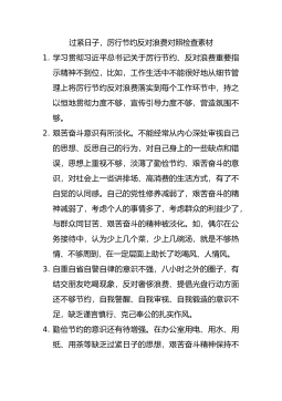 过紧日子,厉行节约反对浪费对照检查素材1.学习贯彻习近平总书记关于厉行节约、反对浪费重要指示精神不到位,比如,工作生活中不能很好地从细节管理上将厉行节约反对浪费落实到每个工作环节中,持之以恒地贯彻力度不够,宣传引导力度不够,营造氛围不够。2.艰苦奋斗意识有所淡化。不能经常从内心深处审视自己的思想、反思自己的行为,对自己身上的一些缺点和错误,思想上重视不够,淡薄了勤俭节约、艰苦奋斗的意识,对社会上一些讲排场、高消费的生活方式,有了不自觉的认同感。自己的党性修养减弱了,艰苦奋斗的精神减弱了,考虑个人的事情多了,考虑群众的利益少了,与群众同甘苦、艰苦奋斗的精神被淡化。如,偶尔在公务接待中,认为少上几...