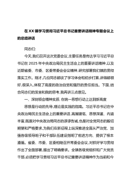 在XX镇学习贯彻习近平总书记重要讲话精神专题会议上的总结讲话同志们:今天,我们召开这次党委会议,主要任务是传达学习习近平总书记在2025年中央政治局民主生活会上的重要讲话精神,以及近期省委、市委、区委常委会会议精神,研究部署我们镇的贯彻落实工作。刚才,几位同志都谈了学习体会和初步打算,讲得都很好,很深入,体现了高度的政治自觉和强烈的责任担当。下面,结合同志们的发言和我的思考,我再讲三点意见。一、深刻领会精神实质,在统一思想行动上达到新高度思想是行动的先导,理论是实践的指南。习近平总书记在中央政治局民主生活会上的重要讲话,高屋建瓴、思想深邃、内涵丰富,既是对中央政治局同志的谆谆告诫,也是对全党同...