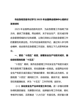 市应急局党组书记学习2025年全国两会精神中心组研讨发言材料(3952字)2025年全国两会的胜利召开,为应急管理工作指明了新方向,提供了新遵循。两会期间,关于安全生产、防灾减灾等应急管理领域的讨论和部署,让我们深刻认识到应急管理工作的重要性和紧迫性。作为市应急局党组书记,通过深入学习两会精神,结合我市应急管理工作实际,我有以下几点思考和体会。一、紧扣“十四五”收官,部署安全生产与防灾减灾,推动目标落地衔接“十五五”“十四五”期间,我市应急管理工作在安全生产和防灾减灾等方面取得了显著成效,但也面临着一些挑战。全国两会对安全生产和防灾减灾提出了更高的要求,我们要以此为契机,全面梳理“十四五”期间...