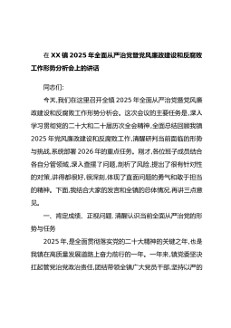在XX镇2025年全面从严治党暨党风廉政建设和反腐败工作形势分析会上的讲话同志们:今天,我们在这里召开全镇2025年全面从严治党暨党风廉政建设和反腐败工作形势分析会。这次会议的主要任务是,深入学习贯彻党的二十大和二十届历次全会精神,全面总结回顾我镇2025年党风廉政建设和反腐败工作,清醒研判当前面临的形势与挑战,系统部署2026年的重点任务。刚才,各位班子成员结合各自分管领域,深入了查摆问题,剖析了风险,提出了很有针对性的对策,讲得都很好,很深刻,体现了直面问题的勇气和敢于担当的精神。下面,我结合大家的发言和全镇的总体情况,再讲三点意见。一、肯定成绩、正视问题,清醒认识当前全面从严治党的形势与...