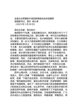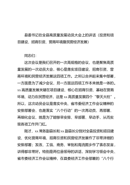 县委书记在全县高质量发展动员大会上的讲话(投资和项目建设、招商引资、营商环境暨民营经济发展)同志们:这次会议是我们召开的一次高规格的会议,也是聚焦高质量发展的一次动员大会,核心是落实项目建设、招商引资、营商环境和民营经济发展这四项工作。之所以合并起来集中部署,一方面是为了减少会议,另一方面这四项工作本来就是一体的。xx高质量发展关键在项目建设、核心在招商引资、基础在营商环境、动力在民营经济,这是xx高质量发展四个“擎天大柱”。所以,这次动员会议是落实中央、省市委经济工作会议精神的安排部署会,也是落实“八个行动”的一次再动员、再部署、再细化会议,就是为了能够早安排、早部署、早动手,从而实现各项工...