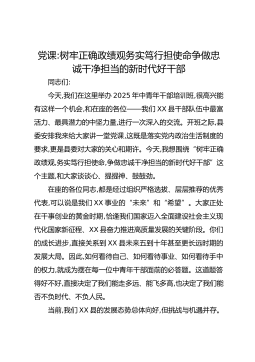 党课:树牢正确政绩观务实笃行担使命争做忠诚干净担当的新时代好干部同志们:今天,我们在这里举办2025年中青年干部培训班,很高兴能有这样一个机会,和在座的各位——我们XX县干部队伍中最富活力、最具潜力的中坚力量,进行一次深入的交流。开班之际,县委安排我来给大家讲一堂党课,这既是落实党内政治生活制度的要求,更是县委对大家的关心和期许。今天,我想围绕“树牢正确政绩观,务实笃行担使命,争做忠诚干净担当的新时代好干部”这个主题,和大家谈谈心、提提神、鼓鼓劲。在座的各位同志,都是经过组织严格选拔、层层推荐的优秀代表,可以说是我们XX事业的“未来”和“希望”。大家正处在干事创业的黄金时期,恰逢我们国家迈入全...