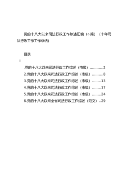 党的十八大以来司法行政工作综述汇编(6篇)(十年司法行政工作工作总结)目录1.党的十八大以来司法行政工作综述(市级)............22.党的十八大以来司法行政工作综述(市级)..........83.党的十八大以来司法行政工作综述(市级)........134.党的十八大以来司法行政工作综述(市级)........175.党的十八大以来司法行政工作综述(市级)........246.党的十八大以来全省司法行政工作综述(范文)..29党的十八大以来司法行政工作综述(市级)xxxx~xxxx年,十年非凡历程,xx市司法行政工作高质量发展,谱写了浓墨重彩的崭新篇章——xxxx年,市司法局成...