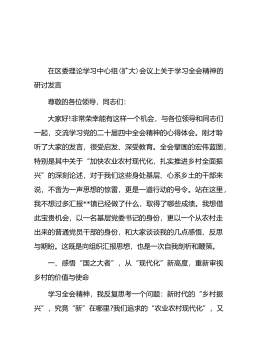 在区委理论学习中心组(扩大)会议上关于学习全会精神的研讨发言尊敬的各位领导,同志们:大家好!非常荣幸能有这样一个机会,与各位领导和同志们一起,交流学习党的二十届四中全会精神的心得体会。刚才聆听了大家的发言,很受启发、深受教育。全会擘画的宏伟蓝图,特别是其中关于“加快农业农村现代化,扎实推进乡村全面振兴”的深刻论述,对于我们这些身处基层、心系乡土的干部来说,不啻为一声思想的惊雷,更是一道行动的号令。站在这里,我不想过多汇报**镇已经做了什么,取得了哪些成绩。我想借此宝贵机会,以一名基层党委书记的身份,更以一个从农村走出来的普通党员干部的身份,和大家谈谈我的几点感悟、反思与期盼。这既是向组织汇报思...