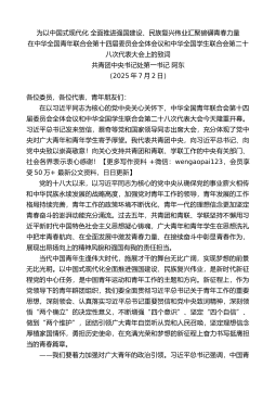 为以中国式现代化全面推进强国建设、民族复兴伟业汇聚磅礴青春力量在中华全国青年联合会第十四届委员会全体会议和中华全国学生联合会第二十八次代表大会上的致词共青团中央书记处第一书记阿东(2025年7月2日)各位委员,各位代表,青年朋友们:在以习近平同志为核心的党中央关心关怀下,中华全国青年联合会第十四届委员会全体会议和中华全国学生联合会第二十八次代表大会今天隆重开幕。习近平总书记发来贺信,蔡奇等党和国家领导同志出席大会,充分体现了党中央对广大青年和青年学生寄予厚望。我代表共青团中央,向习近平总书记、向党中央致以崇高敬意!向关心支持共青团和青联、学联工作的中央有关部门、社会各界表示衷心感谢!【更多写作...