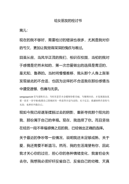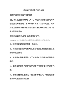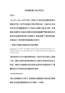 给老婆的爱心检讨书范文范文一20xx年xx月xx日中午的一点零三分,我在给老婆的电话中因意见不和一反平日的温文尔雅,声嘶力竭﹑大喊大叫,并且在讲完之后便重重的扣上了电话.从表面上看,这只是一次普通的夫妻争吵,但是在该事件的背后隐藏着严重的原则性问题,并且此事深深伤害了老婆的心.老婆,我错了,请你原谅我,对造成这一恶性事件的原因我分析如下:一违背了老婆永远是对的之根本原则wengaopai123丈夫守则第一条中明确规定:老婆永远是对的.也就是老婆的话就是命令,对于老婆的观点意图决定丈夫只能认同接受与执行,不存在判断对错的过程,没有任何商量的余地,更不能反对或反抗.我在电话中大吵大嚷还摔电话这一恶...