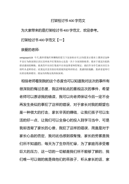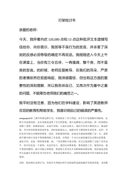 打架检讨书400字范文为大家带来的是打架检讨书400字范文,欢迎参考。打架检讨书400字范文【一】亲爱的老师:wengaopai123今天,我怀着愧疚和懊悔给您写下这份检讨书,以向您表示我对上课讲话这种不良行为的深刻认识以及再也不打架的决心这是一次十分深刻的检查,我对于我这次犯的错误感到很惭愧,我真的不应该打架我不应该违背老师的规定,我们作为学生就应该完全的听从老师的话,而我这次没有很好的重视到老师讲的话。我感到很抱歉,我希望老师可以原谅我的错误,我这次的悔过真的很深刻。相信老师看到我的这个态度也可以知道我对这次的事件有很深刻的悔过态度,我这样如此的重视这次的事件,希望老师可以原谅我的错误,我...