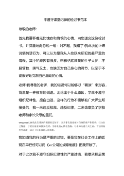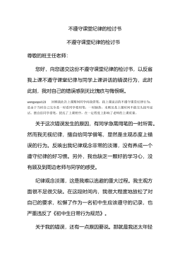 不遵守课堂纪律的检讨书范文不遵守课堂纪律的检讨书1班主任老师:您好!wengaopai123向您递交这份检讨书,反省我上课不遵守课堂纪律的错误行为。回顾开学期间我上课注意力不集中,是因为一些不会做的题目,未顾及是上课时间,影响了自己的上课质量。没有养成正确的学习方式,以后我一定改正错误。关于玩电脑,我以后一定不玩了,因为它会影响我的学习成绩,这次给我敲了一个大大的警钟,辜负了老师对我的期望。您在批评我的时候,不光我的眼睛在流泪,我想要改正这些错误,可是我每次这样想但都没有做到......妈妈说过,学习要靠自觉,对于我的学习退步不是因为我的能力不行,而是我对学习的态度不够端正。从今以后,我要认真...