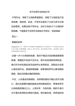 关于没写作业的检讨书不写作业,导致了父母的希望落空,导致了父母的血汗没有结果,我发现,此刻,不写作业背负了太多太多不必背负的罪恶。如果没有不写作业,也许又有多少个父母的梦想成真。下面是关于没写作业的检讨书范文,欢迎阅读!范文一尊敬的老师:wengaopai123今天,我怀着十分的愧疚以及懊悔给您写下这份检讨书,以向您表示我对这不写作业的行为感到抱歉,我认为,我不写作业,是对老师的不尊重,又是浪费了老师辛苦准备的课后作业的心意。这是一次十分深刻的检查,我对于我这次犯的错误感到很惭愧,我真的不应该不交作业,我不应该违背老师的话,我们作为学生就应该完全的听从老师的话,而我这次没有认真完成作业。我感到...