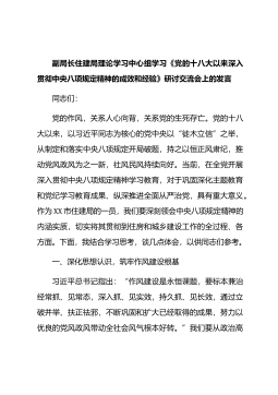 副局长住建局理论学习中心组学习《党的十八大以来深入贯彻中央八项规定精神的成效和经验》研讨交流会上的发言同志们:党的作风,关系人心向背,关系党的生死存亡。党的十八大以来,以习近平同志为核心的党中央以“徙木立信”之举,从制定和落实中央八项规定开局破题,持之以恒正风肃纪,推动党风政风为之一新,社风民风持续向好。当前,在全党开展深入贯彻中央八项规定精神学习教育,对于巩固深化主题教育和党纪学习教育成果、纵深推进全面从严治党,具有重大意义。作为XX市住建局的一员,我们要深刻领会中央八项规定精神的内涵实质,切实将其贯彻到住房和城乡建设工作的全过程、各方面。下面,我结合学习思考,谈几点体会,以供同志们参考。一...