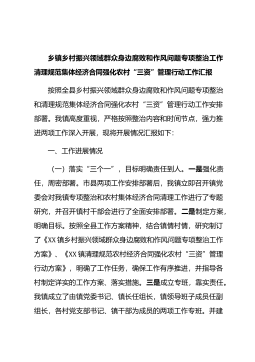 乡镇乡村振兴领域群众身边腐败和作风问题专项整治工作清理规范集体经济合同强化农村“三资”管理行动工作汇报按照全县乡村振兴领域群众身边腐败和作风问题专项整治和清理规范集体经济合同强化农村“三资”管理行动工作安排部署。我镇高度重视,严格按照整治内容和时间节点,强力推进两项工作深入开展,现将开展情况汇报如下:一、工作进展情况(一)落实“三个一”,目标明确责任到人。一是强化责任,周密部署。市县两项工作安排部署后,我镇立即召开镇党委会对我镇专项整治和农村集体经济合同清理工作进行了专题研究,并召开镇村干部会进行了全面安排部署。二是制定方案,明确目标。按照全县工作方案精神,结合镇情村情,研究制订了《XX镇乡村...