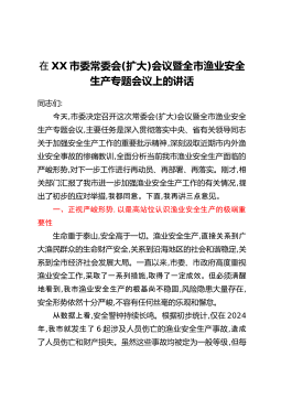 在XX市委常委会(扩大)会议暨全市渔业安全生产专题会议上的讲话同志们:今天,市委决定召开这次常委会(扩大)会议暨全市渔业安全生产专题会议,主要任务是深入贯彻落实中央、省有关领导同志关于加强安全生产工作的重要批示精神,深刻汲取近期市内外渔业安全事故的惨痛教训,全面分析当前我市渔业安全生产面临的严峻形势,对下一步工作进行再动员、再部署、再落实。刚才,相关部门汇报了我市进一步加强渔业安全生产工作的有关情况,提出了初步的应对举措,我都同意。下面,我再三点意。讲见一、正视严峻形势,以最高站位认识渔业安全生产的极端重要性生命重于泰山,安全高于一切。渔业安全生产,直接关系到广大渔民群众的生命财产安全,关系到...
