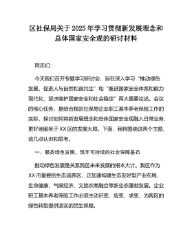 区社保局关于2025年学习贯彻新发展理念和总体国家安全观的研讨材料同志们:今天我们召开专题学习研讨会,旨在深入学习“推动绿色发展,促进人与自然和谐共生”和“推进国家安全体系和能力现代化,坚决维护国家安全和社会稳定”两大重要论述。会议的核心任务,是结合我区社保局企业职工基本养老保险工作的实际,探讨如何将新发展理念和总体国家安全观融入日常业务,更好地服务于XX区的发展大局。下面,我将围绕这两个主题,谈几点认识和思考。一、服务绿色发展,筑牢可持续的社会保障基石推动绿色发展是关系我区未来发展的根本大计。我区作为XX市重要的生态涵养区,正加速构建生态友好型产业布局,生命健康、气候经济、文旅农商融合等新业...