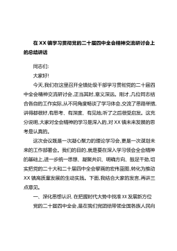 在XX镇学习贯彻党的二十届四中全会精神交流研讨会上的总结讲话同志们:大家好!今天,我们在这里召开全镇处级干部学习贯彻党的二十届四中全会精神交流研讨会,正当其时,意义深远。刚才,几位同志结合各自的工作实际,从不同角度畅谈了学习体会,交流了思路举措,讲得都很好,有思考、有深度、有见地,听了之后很受启发。这充分说明,大家对全会精神的学习是深入的,对XX镇未来发展的思考是认真的。这次会议既是一次凝心聚力的理论学习会,更是一次谋划未来的工作部署会。我们的目的,就是要在深入学习领会全会精神的基础上,进一步统一思想、凝聚共识、明确方向、鼓足干劲,切实把党的二十大和二十届四中全会擘画的宏伟蓝图,转化为推动XX...
