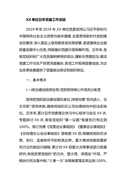XX单位五年党建工作总结2019年至2024年,XX单位党委坚持以习近平新时代中国特色社会主义思想为根本遵循,全面贯彻新时代党的建设总要求,深入落实上级党委各项决策部署,紧紧围绕企业高质量发展中心任务,持续强化党建引领保障作用。五年来,各级党组织和广大党员旗帜鲜明讲政治,履职尽责敢担当,推动党建工作与生产经营深度融合,各项工作取得显著成效,为企业改革发展提供了坚强政治保证和组织保证。一、基本情况(一)政治建设统领全局,党的领导核心作用充分彰显坚持把党的政治建设摆在首位,持续完善"双向进入、交叉任职"领导体制,确保党组织在公司治理结构中的法定地位。五年来,累计召开党委理论学习中心组学习会议XX次...
