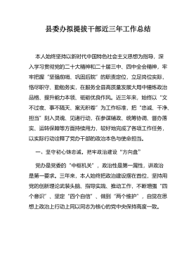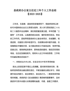 县政府办公室主任近三年个人工作总结【2023-2025】三年来,在县委、县政府的坚强领导下,我始终坚持以新时代中国特色社会主义思想为指导,深入学习贯彻党的二十大和二十届四中全会精神,紧扣高质量发展主题,牢牢把握“三服务”工作主线,以高度的政治自觉、强烈的责任担当、务实的工作作风,团结带领县政府办公室全体同志,忠诚履职、锐意进取,在服务大局中彰显作为,在统筹协调中提升效能,在保障落实中锤炼本领,全力推动各项工作高效运转、有序开展。回首过往,既有耕耘的艰辛,更有收获的喜悦;既经历风雨的考验,也见证发展的跃升。现将本人近三年来的思想、工作和作风建设情况总结如下:一、把稳政治方向之舵,在坚定信念中筑牢...