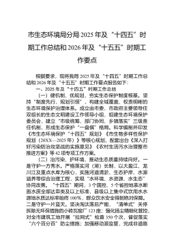 市生态环境局分局2025年及“十四五”时期工作总结和2026年及“十五五”时期工作要点根据要求,现将我局2025年及“十四五”时期工作总结和2026年及“十五五”时期工作要点报告如下:一、2025年及“十四五”时期工作总结(一)健机制、优规划,夯实生态保护制度根基。坚持“制度先行、规划引领”,构建全域覆盖、权责明晰的生态环境保护治理体系。成立由市委、市政府主要领导任双组长的生态文明建设工作领导小组,组建生态环境保护委员会,建立“市级统筹、部门协同、乡镇落实”三级责任机制,形成生态保护“一盘棋”格局。科学编制并印发《市生态环境保护“十四五”规划》《市生物多样性保护规划(20XX—2025年)》等...