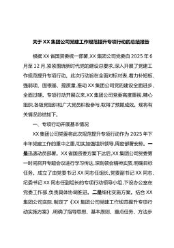 关于XX集团公司党建工作规范提升专项行动的总结报告根据XX省国资委统一部署,XX集团公司党委自2025年6月至12月,紧紧围绕新时代党的建设总要求,深入开展了党建工作规范提升专项行动。此次行动旨在全面对标对表,着力补短板、强弱项、固根基、提质量,推动XX集团公司党的建设全面进步、全面过硬。专项行动开展以来,XX集团公司党委高度重视,精心组织,各级党组织和广大党员积极参与,取得了预期成效。现将有关情况总结如下。一、专项行动开展基本情况XX集团公司党委将此次规范提升专项行动作为2025年下半年党建工作的重中之重,切实加强组织领导,周密部署安排。一是迅速动员部署。XX省国资委方案下达后,XX集团公司...