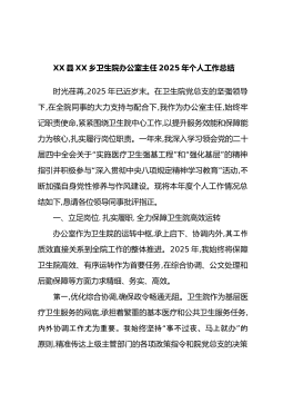 XX县XX乡卫生院办公室主任2025年个人工作总结时光荏苒,2025年已近岁末。在卫生院党总支的坚强领导下,在全院同事的大力支持与配合下,我作为办公室主任,始终牢记职责使命,紧紧围绕卫生院中心工作,以提升服务效能和保障能力为核心,扎实履行岗位职责。一年来,我深入学习领会党的二十“”“”届四中全会关于实施医疗卫生强基工程和强化基层的精神“”指引并积极参与深入贯彻中央八项规定精神学习教育活动,不断加强自身党性修养与作风建设。现将本年度个人工作情况总结如下,恳请各位领导同事批评指正。一、立足岗位,扎实履职,全力保障卫生院高效运转办公室作为卫生院的运转中枢,承上启下、协调内外,其工作质效直接关系到全院...