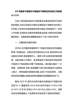 XX市委老干部局关于离退休干部联合党支部工作的探索与思考为深入贯彻落实新时代党的建设总要求和新时代党的组织路线,总结交流我市市直机关离退休干部联合党支部工作经验,分析研判当前面临的形势与挑战,系统谋划下一阶段工作思路,本局结合近期专项调研座谈成果,对联合党支部的建设现状、发展困境及破解路径进行了深入研究与思考。一、主要成效与基本现状近年来,在市委的坚强领导下,市直机关联合党支部建设取得了显著成效。各联合党支部自成立以来,始终坚持以政治建设为统领,紧紧围绕中心、服务大局,在规范党员教育管理、创新党建工作模式、促进离退休干部优势作用发挥等方面进行了有益探索,“积累了宝贵经验。通过建立健全一方”隶属...