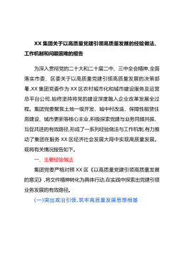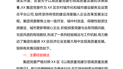XX集团关于以高质量党建引领高质量发展的经验做法、工作机制和问题困难的报告为深入贯彻党的二十大和二十届二中、三中全会精神,全面落实市委、区委关于以高质量党建引领高质量发展的决策部署,XX集团党委作为XX区农村城市化和城市建设服务及运营总平台公司,始终坚持将党的建设深度融入企业改革发展全过程。集团党委聚焦土地一级开发、城中村改造、保障性租赁住房建设、城市更新等核心主业,积极探索党建与业务同频共振、互促共进的有效路径,形成了一系列经验做法与工作机制,有力推动了集团在服务XX区经济社会发展大局中实现高质量发展。现将有关情况报告如下。一、主要经验做法集团党委严格对照XX区《以高质量党建引领高质量发展的...