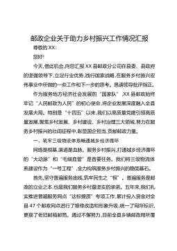 邮政企业关于助力乡村振兴工作情况汇报尊敬的XX:您好!今天,借此机会,向您汇报XX县邮政分公司在县委、县政府的坚强领导下,立足行业优势,践行国家战略,在服务乡村振兴宏伟事业中所做的一些工作和下一步的思考。恳请领导批评指正。作为服务地方经济社会发展的“国家队”,XX县邮政始终牢记“人民邮政为人民”的初心使命,将企业发展深度融入全县发展大局。特别是“十四五”以来,我们以高质量党建引领高质量发展,聚焦乡村发展、乡村建设、乡村治理三大领域,努力在服务乡村振兴的壮阔征程中,彰显国企担当,贡献邮政力量。一、筑牢三级物流体系畅通城乡经济循环网络是根基,渠道是血脉。服务乡村振兴,打通城乡经济循环的“大动脉”和...