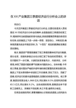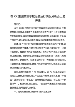 在XX集团前三季度经济运行情况分析会上的讲话同志们:今天,集团公司召开这次前三季度经济运行情况分析会,主要任务是全面复盘今年前三个季度的各项工作,深入分析当前面临的形势与挑战,精准部署第四季度的攻坚任务,动员集团上下全体干部职工,凝心聚力,决战决胜,确保全面完成年度各项目标任务。刚才,20个部门和子(代)管公司的负责同志都作了汇报,实事求是地总结了成绩,不遮不掩地摆出了问题,也提出了下一步的工作思路。集团班子的其他同志也分别作了点评,提出了具体要求,我都同意。总的来看,这次会议开得很成功,是一次统一思想、分析形势、明确任务、鼓舞干劲的会议。大家的汇报内容详实,问题找得准,措施定得实,体现了求真...