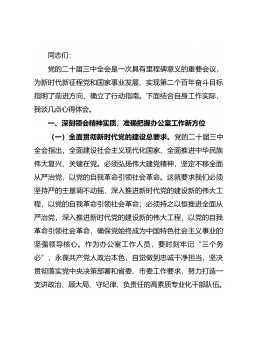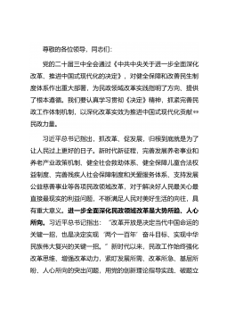 尊敬的各位领导,同志们:党的二十届三中全会通过《中共中央关于进一步全面深化改革、推进中国式现代化的决定》,对健全保障和改善民生制度体系作出重大部署,为民政领域改革实践指明了方向、提供了根本遵循。我们要认真学习贯彻《决定》精神,抓紧完善民政工作体制机制,以深化改革实效为推进中国式现代化贡献**民政力量。习近平总书记指出,抓改革、促发展,归根到底就是为了让人民过上更好的日子。新时代新征程,完善发展养老事业和养老产业政策机制、健全社会救助体系、健全保障儿童合法权益制度、完善残疾人社会保障制度和关爱服务体系、支持发展公益慈善事业等各项民政领域改革,对于解决好人民最关心最直接最现实的利益问题,不断满足人...