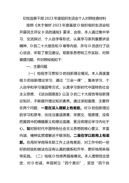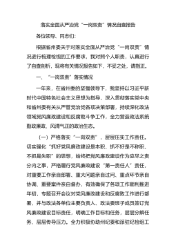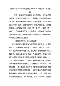 副局长关于2023年履行全面从严治D“一岗双责”情况报告一年来,我始终坚持以新时代中国特色社会主义思想为指导,认真学习贯彻D的二十大精神,坚决贯彻落实中央、省、市委关于全面从严治D的决策部署,切实扛起全面从严治D职责,坚持问题导向、加强研究谋划、狠抓整改落实、从严监督问责,树牢“四个意识”,坚定“四个自信”,严格落实从严治D主体责任,较好完成了廉政建设各项任务目标。现将全年履行全面从严治D主体责任和个人廉洁自律情况汇报如下:一、加强理论学习,强化思想武装始终坚持把加强思想政治理论学习放在首位,认真领会D的二十大精神,在思想上、认识上、理论上、行动上与D中央始终保持高度一致。通过局D组组织的集中...