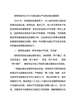 集团党委书记履行2025年全面从严治党主体责任工作汇报按照省国资委党委的统一部署,*集团党委自2025年初起,紧扣高质量发展首要任务,深入开展了为期一年的国企党建规范提升专项行动。集团党委坚持将此次专项行动作为提升党建引领效能、破解发展难题、厚植竞争优势的战略抓手,聚焦省国资委明确的七个方面重点任务,系统谋划、精准施策、扎实推进,取得了阶段性显著成效,为集团实现“十四五”规划目标提供了坚强的政治保证和组织保证。现将有关情况总结如下。一、强化理论武装,筑牢思想根基取得新高度集团党委坚持将党的创新理论武装作为首要政治任务,推动理论学习往深里走、往实里走、往心里走。一是突出“关键少数”示范引领。严格...