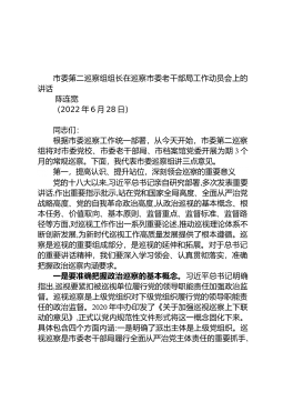 市委第二巡察组组长在巡察市委老干部局工作动员会上的讲话 陈连宽 (2022年6月28日)同志们:根据市委巡察工作统一部署,从今天开始,市委第二巡察组将对市委党校、市委老干部局、市档案馆党委开展为期3个月的常规巡察。下面,我代表市委巡察组讲三点意见。第一,提高认识、提升站位,深刻领会巡察的重要意义党的十八大以来,习近平总书记亲自研究部署,多次发表重要讲话,作出重要指示批示,站在党和国家全局高度、全面从严治党战略高度、党的自我革命政治高度,从政治巡视的基本概念、根本任务、价值取向、基本原则、监督重点、监督标准、监督路径等方面,对巡视工作作出一系列重要论述,推动巡视理论体系不断创新发展,为新时代巡视...