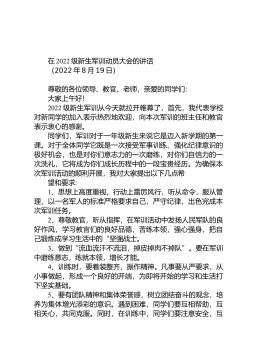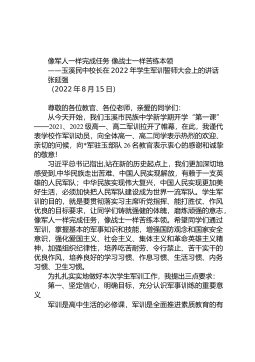 像军人一样完成任务像战士一样苦练本领——玉溪民中校长在2022年学生军训誓师大会上的讲话张延强(2022年8月15日)尊敬的各位教官、各位老师,亲爱的同学们:从今天开始,我们玉溪市民族中学新学期开学“第一课”——2021、2022级高一、高二军训拉开了帷幕,在此,我谨代表学校作军训动员,向全体高一、高二同学表示热烈的欢迎、亲切的问候,向*军驻玉部队26名教官表示衷心的感谢和诚挚的敬意!习近平总书记指出,站在新的历史起点上,我们更加深切地感受到,中华民族走出苦难、中国人民实现解放,有赖于一支英雄的人民军队;中华民族实现伟大复兴,中国人民实现更加美好生活,必须加快把人民军队建设成为世界一流军队。学...