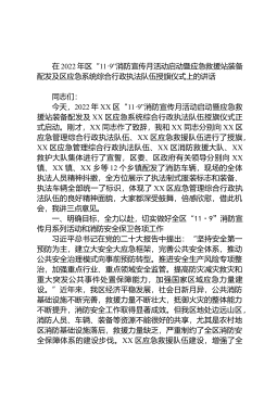 在2022年区“11·9”消防宣传月活动启动暨应急救援站装备配发及区应急系统综合行政执法队伍授旗仪式上的讲话