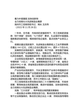 着力补链强链加快创新转全力培育壮大先进制造业集群扬州市工信局党组书记、局长王庆伟(2022年11月26日)一年来,在市委、市政府的坚强领导下,市工信局紧紧围绕“四个突破”目标和“七个抓好”要求,扎实做好补链强链,强势推进创新转型,精准做好助企服务,重点优势产业承压上行。规模总量实现新提升,先进制造业集群规上工业开票销售总量达3903亿元,占规上企业比重达到74%,提升4个百分点。发展质态实现新提升,新能源、电子信息、新型医疗器械化工新材料等产业增幅高于面上、领跑全市,传艺钠离子电池、礼邦生物医药、领益精密部件等一批重大项目落地开工。企业转型实现新提升,新增国家级制造业单项冠军3家、专精特新“小...