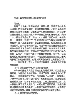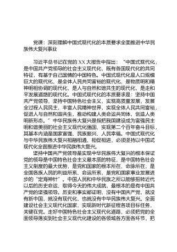 党课:深刻理解中国式现代化的本质要求全面推进中华民族伟大复兴事业习近平总书记在党的XX大报告中指出:“中国式现代化,是中国共产党领导的社会主义现代化,既有各国现代化的共同特征,有基于自己国情的中国特色。中国式现代化是人口规模巨大的现代化,是全体人民共同富裕的现代化,是物质明和精神明相协调的现代化,是人与自然和谐共生的现代化,是走和平发展道路的现代化。中国式现代化的本质要求是:坚持中国共产党领导,坚持中国特色社会主义,实现高质量发展,发展全过程人民民主,丰富人民精神世界,实现全体人民共同富裕,促进人与自然和谐共生,推动构建人类命运共同体,创造人类明新形态。”中华民族伟大复兴是指把我国建设成为富强...