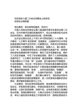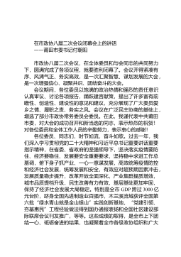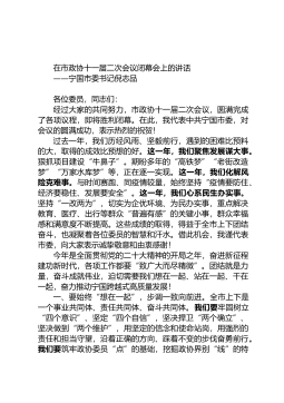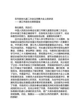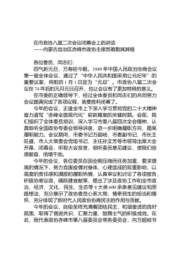 在市政协八届二次会议闭幕会上的讲话——内蒙古自治区赤峰市政协主席苏雅勒其其格各位委员、同志们:四气新元旦,万寿初今朝。1949年中国人民政治协商会议第一届全体会议,通过了“中华人民共和国采用公元纪年”的重要议案,将阳历1月1日定为“元旦”。市政协八届二次会议在74年后的元月元日召开,也让会议有了更加特殊的意义。在市委的正确领导下,经过全体委员和同志们的共同努力会议圆满完成了各项议程,就要胜利闭幕了。今年的会议,正逢全市上下深入学习贯彻党的二十大精神奋力谱写“赤峰全面现代化”崭新篇章的关键时期。会前,我们组织了全体委员培训,深入学习市委八届四次全会精神,认真聆听全国政协专委会领导讲座,进一步明确...