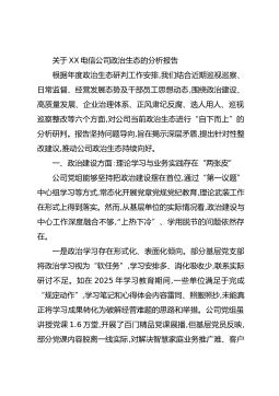 关于XX电信公司政治生态的分析报告根据年度政治生态研判工作安排,我们结合近期巡视巡察、日常监督、经营发展态势及干部员工思想动态,围绕政治建设、高质量发展、企业治理体系、正风肃纪反腐、选人用人、巡视巡察整改等六个方面,对公司当前政治生态进行“自下而上”的分析研判。报告坚持问题导向,旨在揭示深层矛盾,提出针对性整改建议,推动公司政治生态持续向好。一、政治建设方面:理论学习与业务实践存在“两张皮”公司党组能够坚持把政治建设摆在首位,通过“第一议题”中心组学习等方式,常态化开展党章党规党纪教育,理论武装工作在形式上得到落实。然而,从基层单位的实际情况看,政治建设与中心工作深度融合不够,“上热下冷”、学...