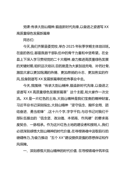 党课:传承大别山精神,锻造新时代先锋,以奋进之姿谱写XX高质量绿色发展新篇章同志们:今天,我们齐聚县委党校,举办2025年秋季学期主体培训班。在座的各位,都是我县干部队伍中的骨干力量和中坚希望。在全县上下深入学习贯彻党的二十大精神,奋力推进高质量绿色发展的关键时期,组织这次培训,目的就是为大家加油充电、补钙壮骨,激励大家以更加饱满的热情、更加昂扬的斗志、更加务实的作风,投身到谱写XX发展新篇章的宏伟事业中去。今天,我围绕“传承大别山精神,锻造新时代先锋,以奋进之姿谱写XX高质量绿色发展新篇章”这个主题,和大家作一次交流。XX是一片红色的土地,大别山精神是我们宝贵的精神财富。习近平总书记深刻指出...