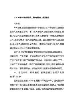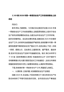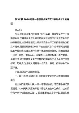 在XX镇2026年第一季度安全生产工作推进会议上的讲话同志们:今天,我们在这里召开全镇2026年第一季度安全生产工作推进会议,主要任务是深入学习贯彻习近平总书记关于安全生产的重要论述,全面传达落实上级关于安全生产工作的最新会议和文件精神,回顾总结我镇2025年安全生产工作,分析研判当前面临的严峻形势,安排部署今年第一季度的重点任务。目的就是进一步统一思想、提高认识、压实责任,以最高标准、最严要求、最实举措,坚决守住安全生产这条不可逾越的红线,为全年工作开好局、起好步,为全镇人民营造一个安全、稳定、祥和的生产生活环境。下面,我讲三个方面的意见。一、统一思想,认清形势,深刻领会安全生产工作的极端重...