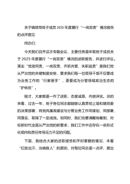 关于镇领导班子成员2025年度履行“一岗双责”情况报告的点评意见同志们:今天我们召开这次专题会议,主要任务是听取班子成员关于2025年度履行“一岗双责”情况的述职报告,并进行评议。落实“党政同责、一岗双责、齐抓共管、失职追责”是我们党从严治党的关键制度安排,要求我们每一位领导干部不仅要成为业务工作的“行家里手”,更要成为分管领域政治生态的“护林员”。刚才,大家都逐一作了述职,态度诚恳、内容详实。总的来看,过去一年,班子各位同志都能够认真贯彻上级和镇党委的决策部署,将党风廉政建设与分管业务工作同谋划、同部署、同落实,取得了一定成效。但同时,我们也要清醒地看到,对标新时代全面从严治党的新要求,我们...